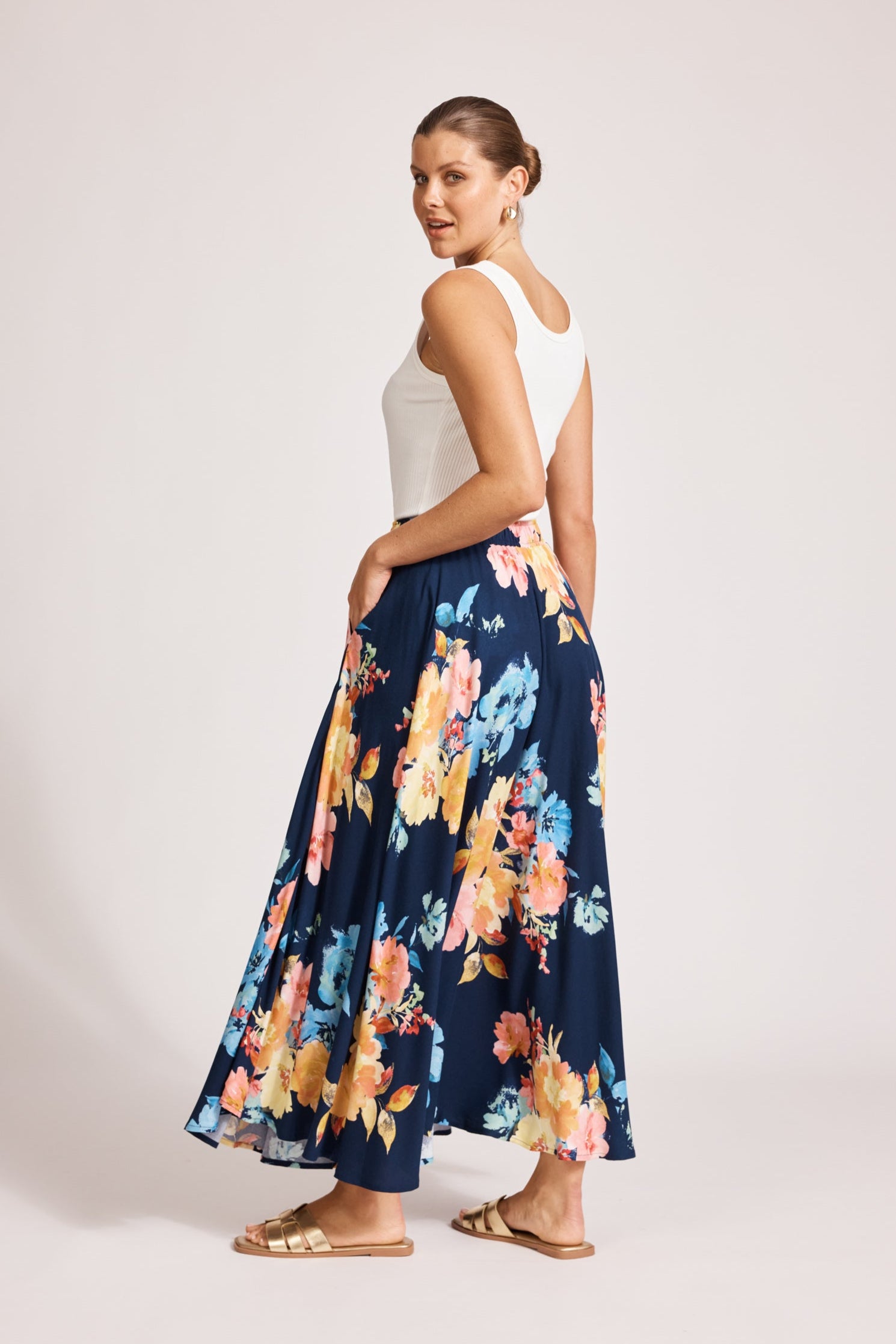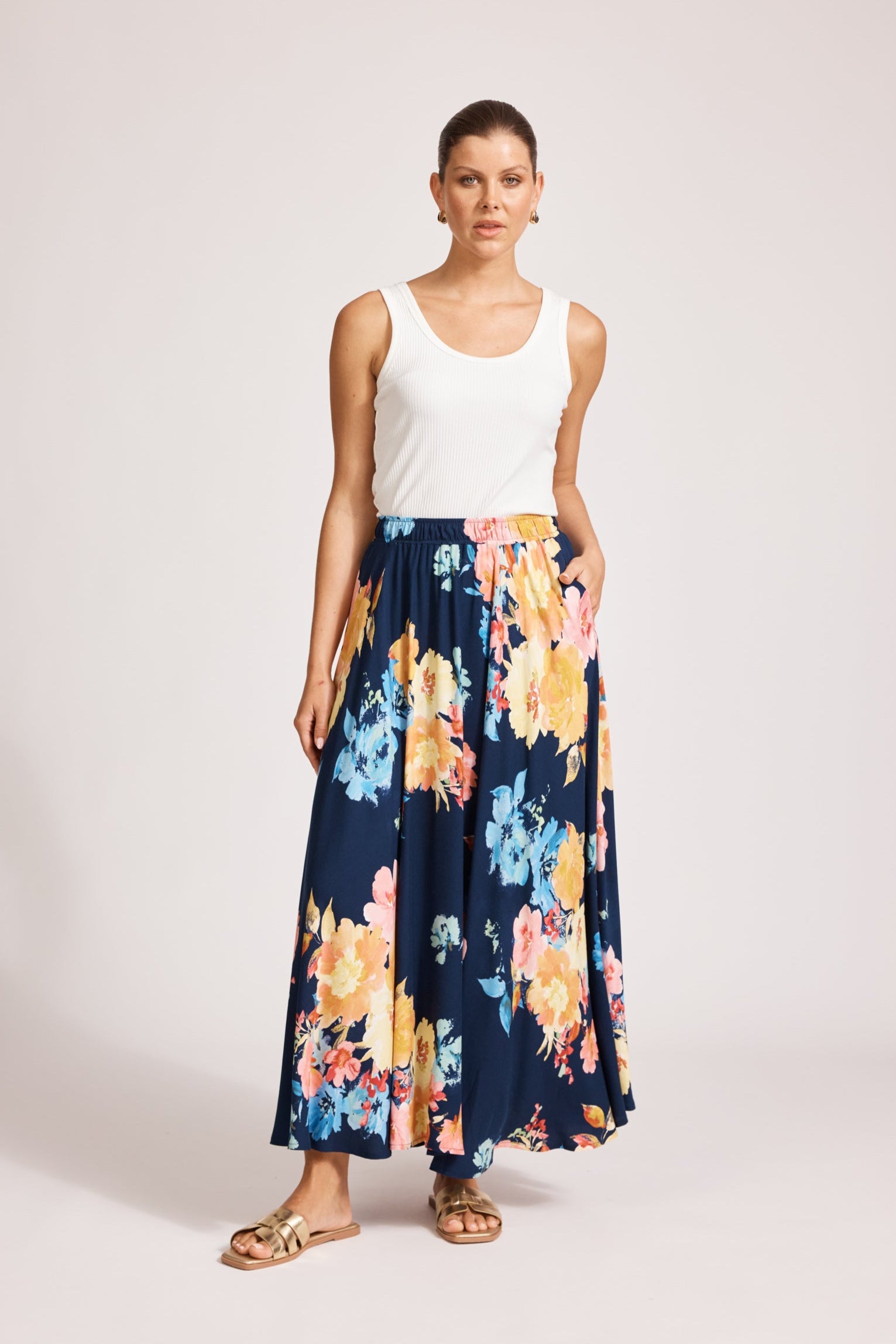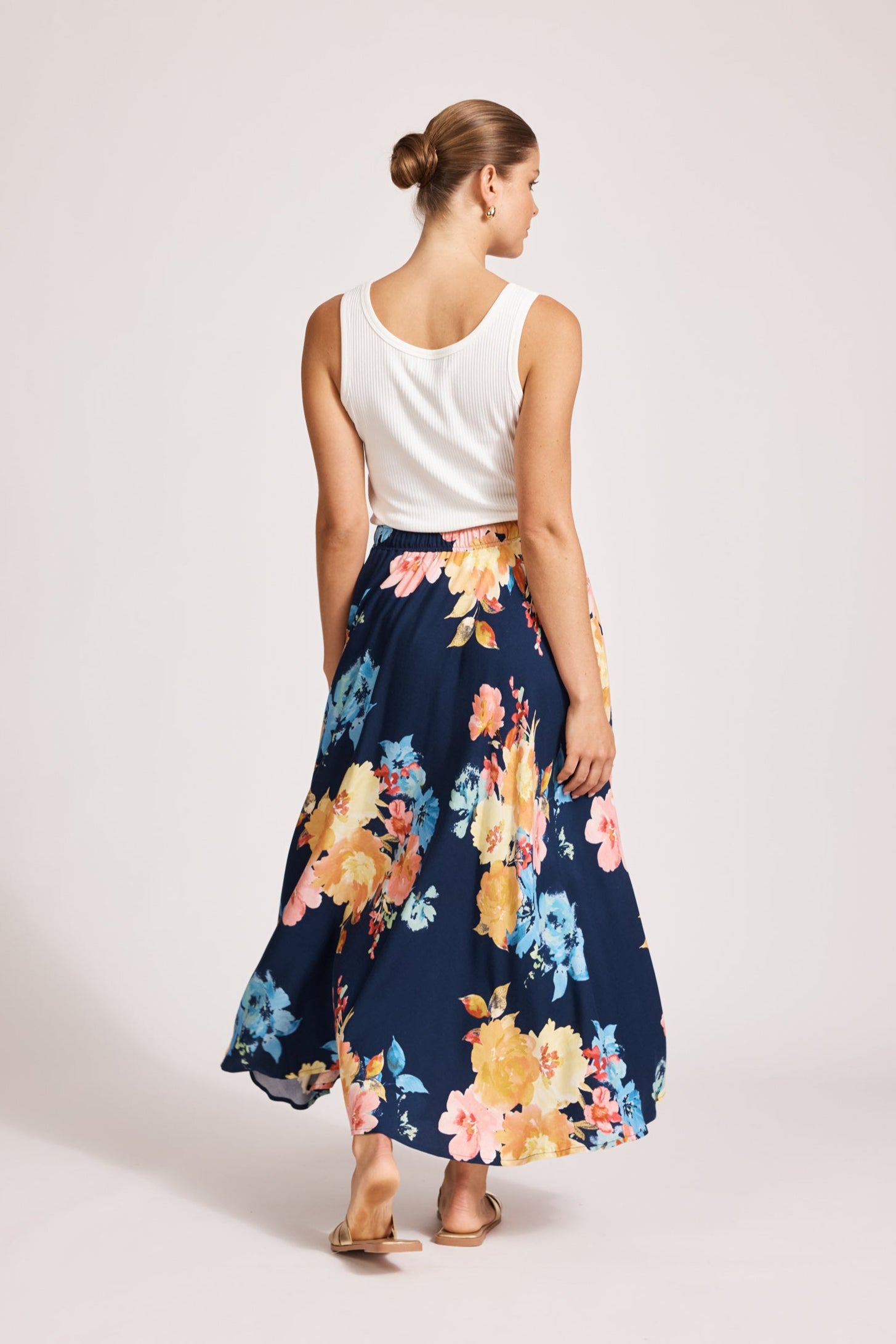 A flowing printed maxi skirt designed to flatter. Crafted from soft viscose for natural drape, in exclusive print. Features a full elastic waistband and finished with panel seam detailing for subtle texture and movement.