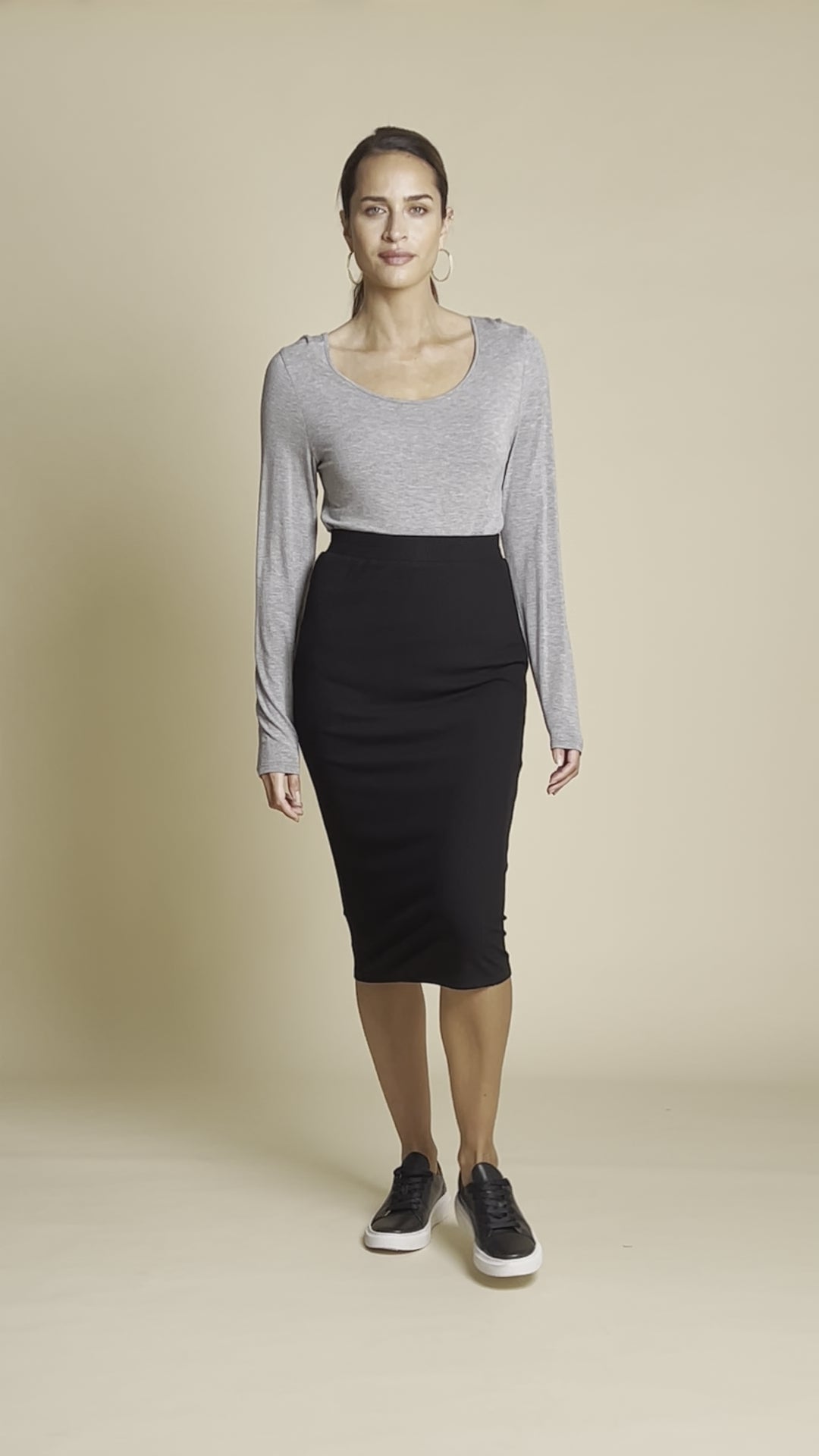 Feel your best in the Studio Jersey Skirt, made with a soft and stretchy fabric for casual comfort. Simple yet sophisticated, this figure-hugging style captures your silhouette with its flattering, midi-length design. Wear it for a casual lunch with friends by pairing it with a knit, a thick snood and sneakers.