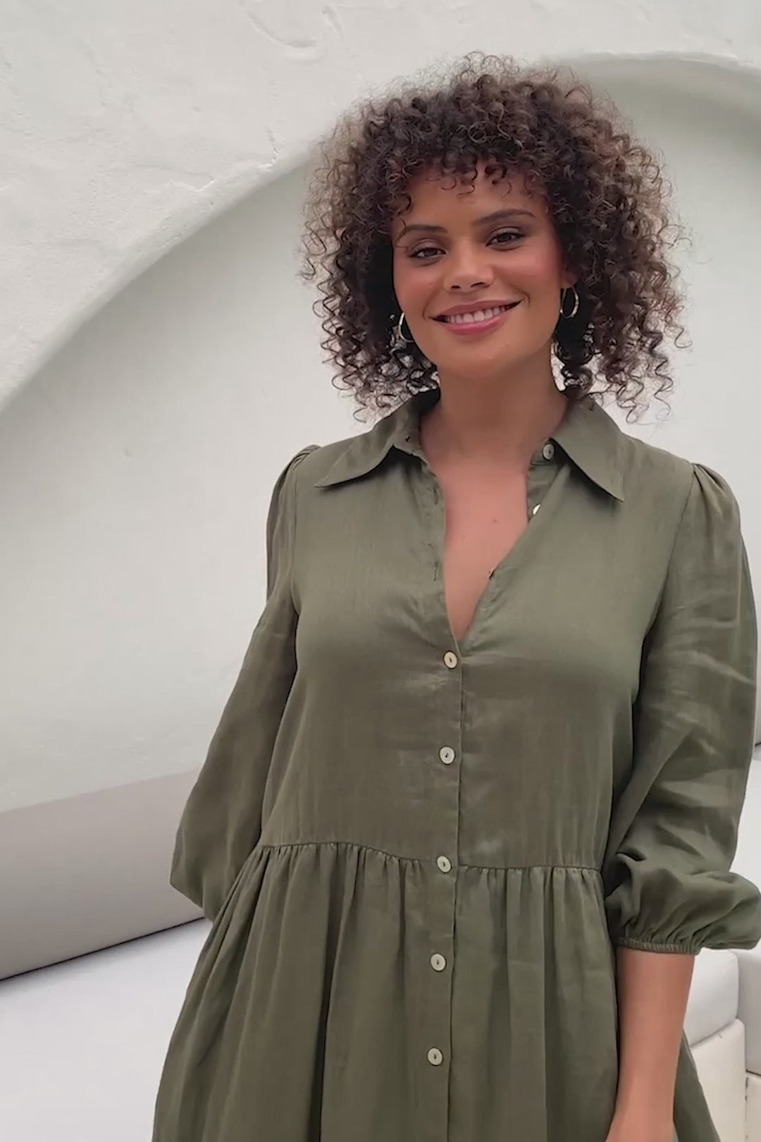 A modern take on a classic shirt dress. Crafted from 100% linen with a softly textured feel. Features a collared neckline, button-through front, and gathered waist detail for gentle shaping. Long balloon sleeves with cuffs add volume and elegance. Finished with subtle striped contrast trim at the inner collar and placket.